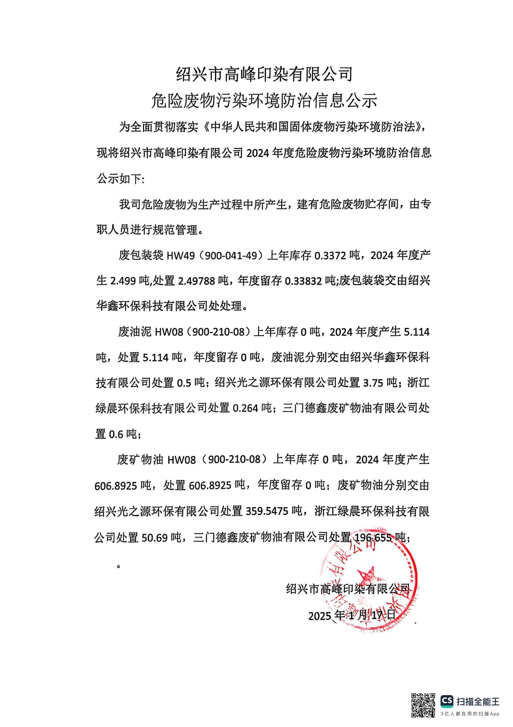 绍兴市高峰印染有限公司危险废物污染环境防治信息公示
